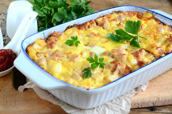 Запеканка из гороха и картофеля : горох, картофель, репчатый лук, растительное масло, яйца, сухари, сметана, соус.