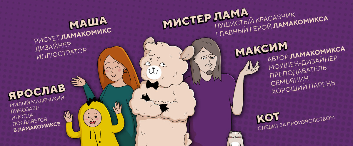 Максим — автор Ламакомикса, моушен-дизайнер, семьянин и хороший парень. Мистер Лама — пушистый красавчик, главный герой Ламакомикса. Маша — дизайнер-иллюстратор, рисует Ламакомикс и следит за детьми: за Максимом, за Ламой и за Ярославом))