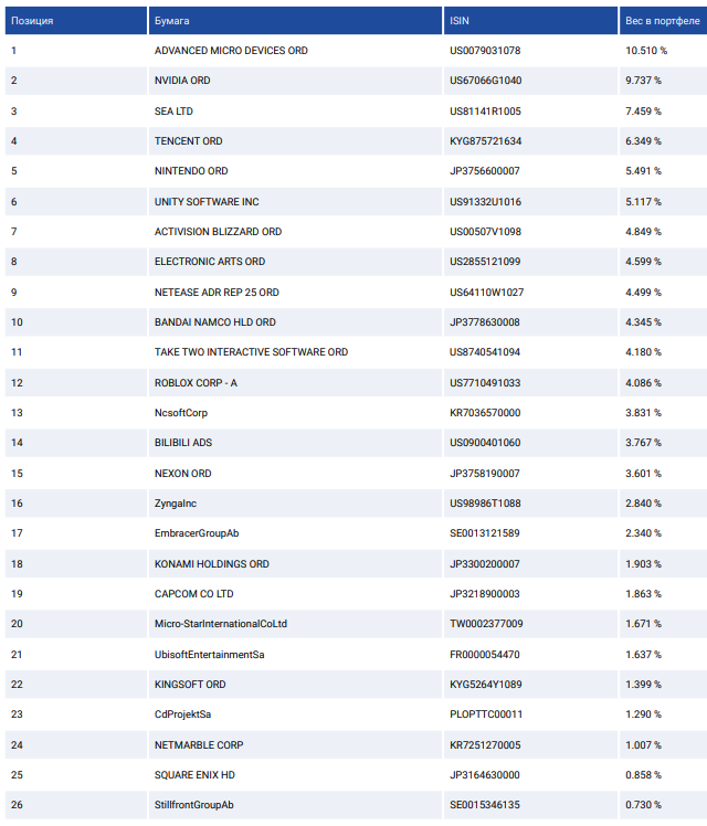 Всем привет! Вы на канале Начинающего инвестора! 👋🏻 Сегодня очередное пополнение портфеля с нуля и разбор фонда FXES на игровую индустрию 🎮 Поехали! FXES - что за фонд? Этот фонд позволяет вложить свои средства в одну отрасль, так называемый тематический фонд. Тема фонда - индустрия видеоигр и киберспорта. Сам фонд отслеживает индекс MVIS Global Video Gaming and eSports. В фонде всего (или не всего) 26 бумаг. Процентное распределение между бумагами ниже на картинке. Из интересного - nVidia и AMD составляют пятую часть всего фонда. Также в наличии небезызвестный китайский Tencent, японские Nintendo, CAPCOM и KONAMI 🇯🇵 Кроме всего прочего, тут есть симпатичные мне Roblox и Unity (в которых не зашёл недавно на IPO, а надо было) и Square, обзор на который делал недавно в Дзен, а в Телеграм была информация по последнему отчету 👈🏻 Доли по отраслям Здесь всё достаточно просто - IT и телекоммуникации. О чём, собственно, и сообщалось в начале. Если вы считаете это направление перспекти