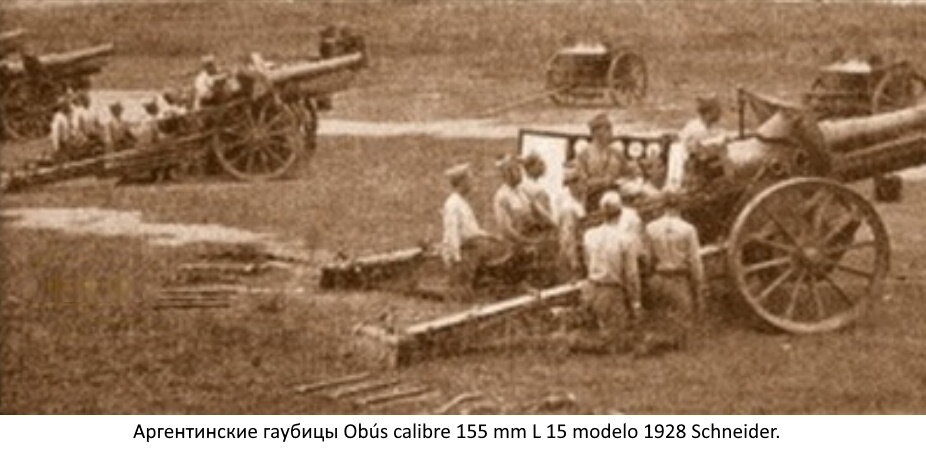 Весьма неплохо получилось у фирмы «Шнейдер» с новой 155-мм пушкой. Хотя и немного тяжеловатое новое орудие, но зато достаточно мощное. Кстати, это двоюродная сестра нашей 152-мм гаубицы-пушки обр. 1937 года, так что вполне можно сравнивать. В самой Франции орудий подобного класса было более 1100 штук, так что на родине его не приняли. А вот в Аргентине пушка пришлось ко двору.
