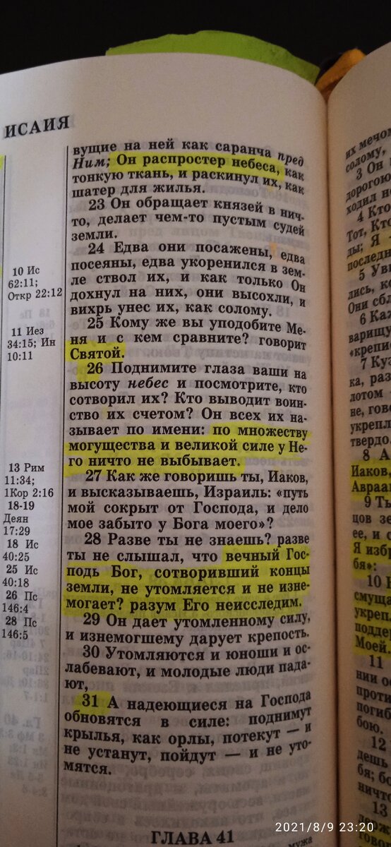 Как-то раз я ехала в Питер на учёбу на поезде в купе с одним молодым человеком. Мы разговорились. Я сказала о своей вере. И он попросил меня поделиться чем-то особенным, личным. Я подумала... Мне захотелось процитировать одно из моих любимых мест Библии из 40-й главы книги пророка Исаии (стихи 26, 27-31). Я объяснила, что прочитаю стихи из Библии, мои любимые. Но это не просто поэтические стихи, а это Слово Божье. Человек согласился. И вот я приготовилась. Про себя подумала, что сейчас я с выражением прочитаю, чтобы этот молодой человек прочувствовал величие и великолепие этих Слов. Ну вероятно я думала, что величие будет в моей особой величественной манере исполнения... Я начала достаточно помпезно. "Поднимите глаза ваши на высоту небес и посмотрите, кто сотворил их? " Но сбилась, забыла следующие слова. Как же быть, мне же нужно рассказать это хорошо, мне нужно донести этот важный смысл... Я вспоминала по-немногу: Кто выводит воинство их счётом? Он всех их называет по имени: п