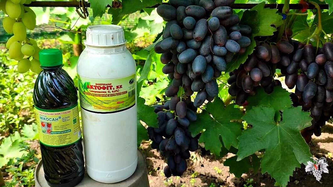 Сегодня я расскажу Вам об обработке винограда. А именно, я расскажу Вам чем обрабатывать виноград в период созревания ягод. Данная тема будет особенно актуальна для тех виноградарей, у которых сейчас на винограднике наблюдаются проявления болезней (Милдью, Оидиум и так далее). А также тема будет актуальна для тех виноградарей, которые хотят провести профилактическую обработку винограда в период созревания ягод. Иными словами, данный выпуск подойдёт для тех, у кого урожай почти созрел и уже нельзя применять препараты с большими сроками ожидания. В данный период (период созревания ягод) для обработки винограда лучше всего использовать биопрепараты. Конкретно я буду применять препарат под названием «Микосан В». Данный препарат хорошо работает по грибковым заболеваниям (Милдью, Оидиум). Например, при вспышке Милдью препарат «Микосан В» отлично справился с пятнами поражения до 1 сантиметра. Применял я данный препарат в пропорции 300 миллилитров на 10 литров воды. Против Оидиума данный преп