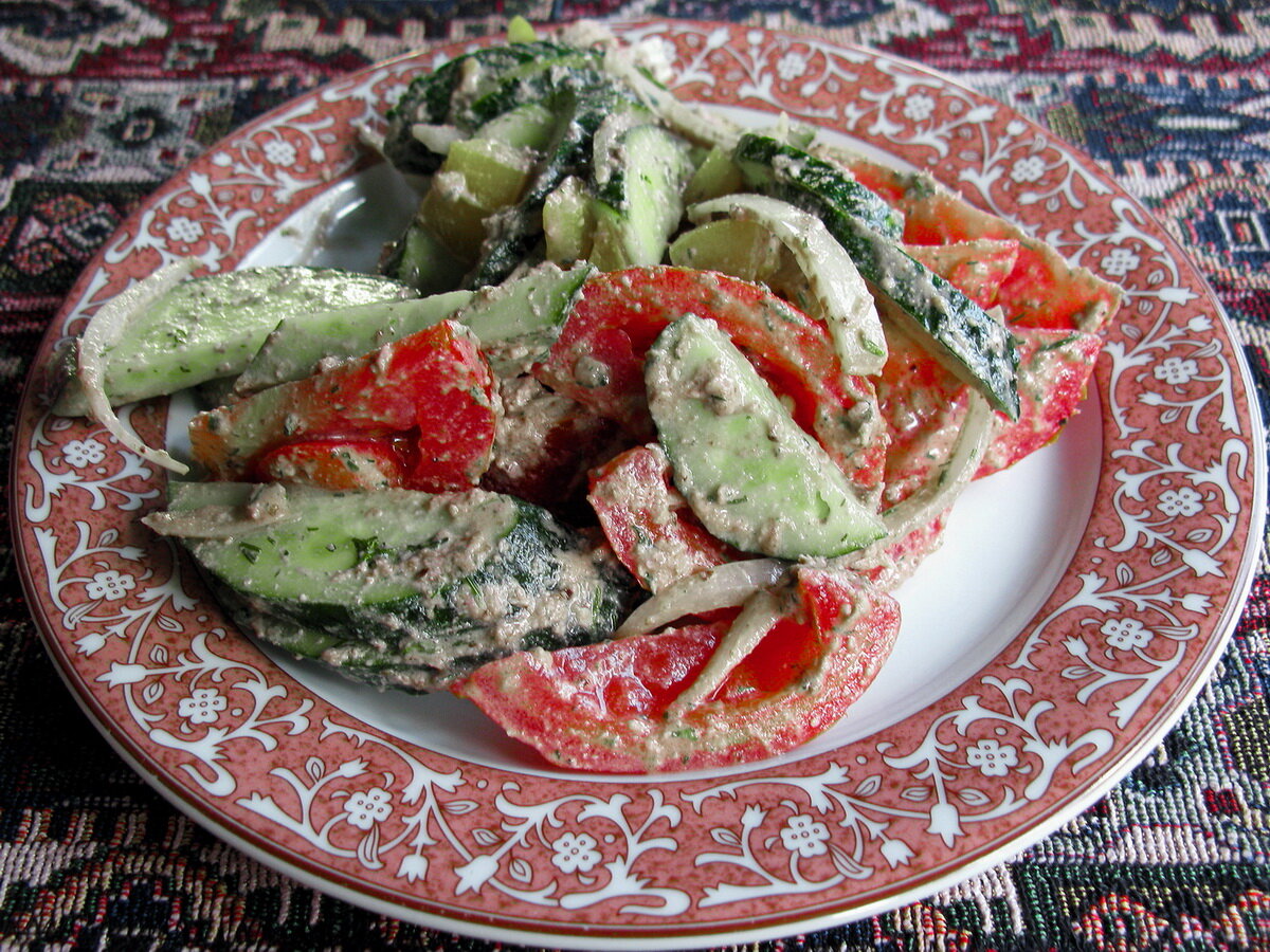 В ресторанах Грузии я никогда не заказывала салат из огурцов и помидоров. Не понимала, зачем есть «скучную» закуску, когда в меню так много всего интересного. Как же я ошибалась! Оказывается, все решает заправка. Теперь я постоянно беру «грузинский салат» и дома готовлю только так. Один вопрос: почему я не знала этого раньше? Уверена, что и вам понравится грузинский рецепт. Грузинский салат Именно так он обозначен в меню. Состав обычно не пишут. Спросите официантов, из чего готовят «грузинский салат». Вам ответят, что он состоит из огурцов и помидоров. Ну и кто захочет его брать после такого анонса?! Уж лучше заказать пхали или ассорти солений. На самом деле «грузинский салат» уникален. Он пикантный и освежающий. Все дело в том, что его заправляют щедрой порцией орехового соуса и большим количеством чеснока, лука, зелени. С ними огурцы и помидоры приобретают совершенно иной вкус. Как приготовить Тот же салат мне предложили в гостях у грузинской семьи. Я сразу расспросила хозяйку о запр