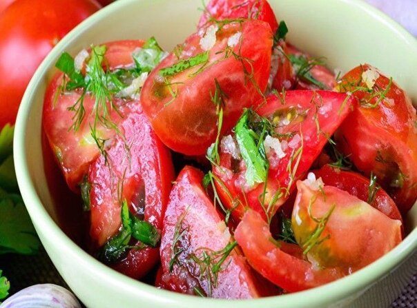Ингредиенты: -2 кг помидор порезать крупно (пополам) -4 шт. болгарских перца -2 головки чеснока -2 шт красный жгучий перец -зелень Заправка: -100 гр. уксуса -100 гр. растит. масла -100 гр. сахара -2 ст. л. соли. Приготовление: 1. Перец, чеснок, красный жгучий перец 2 шт ,перекрутить на мясорубке . 2. Перемешать. Зелень порезать. Добавить заправку. 3. Укладывать слоями в 3-х литровую банку: помидоры, затем смесь из овощей, зелень. 4. Банку закрыть крышкой и поставить в холодильник в перевернутом виде на горлышко. 5. Это для того, чтобы через 8 часов уже было готово к употреблению сверху. 6. Вечером сделала, утром уже готово! 7. А после можно держать в обычном положении.