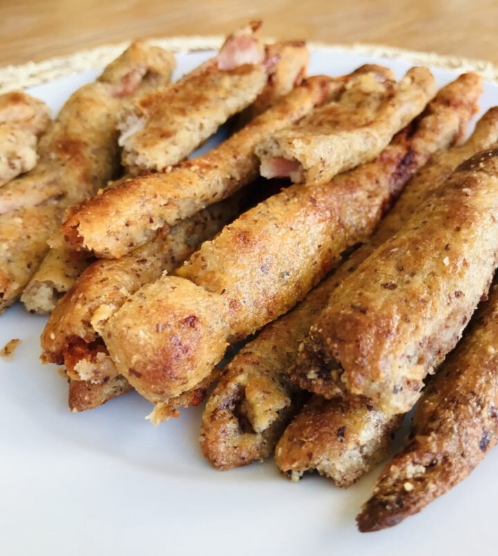 Хлебные палочки Ингредиенты: 🔹 190 г твердой моцареллы 🔹 60 г сливочного масла 🔹 50 г миндальной муки 🔹 25 г кокосовой муки 🔹 1 ч л разрыхлителя 🔹 1 яйцо 🔹 1 желток Для начинки 🔹 20 г грецких орехов 🔹 10 г шоколада 80%+ или 🔹 4 ломтика бекона или 🔹 1 ч л томатной пасты 🔹 соль и специи итальянские травы Приготовление: 1 Растопите в микроволновке (около 30 секунд) моцареллу и сливочное масло 2 Перемешайте и добавьте все сухие ингредиенты – миндальную, кокосовую муку и разрыхлитель. 3 Замешайте тесто. По необходимости, если тесто не схватывается, просто поставьте его еще в микроволновку (не больше 15 секунд) – моцарелла подтает и хорошо смешается с мукой 4 Как смесь сыра и муки будет готова, вбейте в нее яйцо. Только будьте осторожны, убедитесь, что тесто не супер горячее, а просто теплое, иначе яйцо свернется 5 Как тесто будет окончательно готово, возьмите лист бумаги для выпечки, выложите на него ваше прекрасное тесто и накройте таким же листом бумаги. Теперь вы можете с