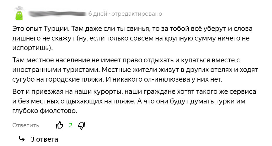 Почему-то долгожданный летний отдых нередко сопровождается у отпускников-туристов разочарованием и недовольством. Сервис не тот, юг слишком жаркий, море слишком мокрое… В этом году большая часть негатива вылилась в адрес российских курортов просто потому, что другие почти все недоступны. В одной из статей на нашем канале ("Мы вам деньги везем!" Что жители курортных городов должны отдыхающим) мы недавно пытались осмыслить причины недовольства отдыхающих. В комментариях под статьей читатели активно делились мнениями да так, что от некоторых "предложений" у меня волосы дыбом встали. Люди, ау! Это что, сценарий фильма антиутопии готовим? Все коренные жители курортов, брысь в гетто, тут туристы из N-ска заехать изволили?! Есть противоположное предложение, по сути, ничуть не лучше. С той только разницей, что отселять и огораживать забором предлагается туристов. Как взрослые люди могут всерьез говорить о подобном? Понимаю, что многие отдыхающие, избалованные турецко-египетским сервисом по тип