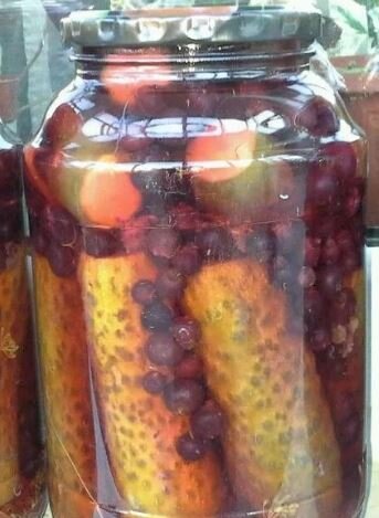 Маринованные огурцы со смородиной Я очень люблю маринады и поэтому заготавливаю на зиму их в большом количестве.Этот рецепт салата красивый по виду и очень вкусный, хорошо подходит в качестве закуски. Нам понадобятся продукты: На 3 литра, 1,5-2 кг.огурцов, 1 кг. смородины, В каждую банку: 4 зубчика чеснока, 1 зонтик укропа 7 горошин черного перца, Для маринада на 1 литр воды: 1 ст.л.сахара, 1/5 ст.л.соли, 1/2 ст.уксуса 9%, Приготовление: 1.Огурцы замачиваем на 5 часов в миске с водой, обрезаем кончики.Если огурцы крупные можно их разрезать на 2-3 части. Вариант 1 2.В банки складываем чеснок, укроп, специи. 3.Из смородины выжимаем сок, в него добавляем соль, сахар.Все это кипятим минуты 2.Заливаем кипящим маринадом огурцы,стерилизуем 20 минут.В каждую банку вливаем 2 ст.л.уксуса,закатываем. Вариант 2 2.В банки складываем чеснок, укроп, специи, смородину и огурцы.Заливаем кипятком из чайника дважды.Затем сливаем остывший маринад и кипятим снова с сахаром, солью и уксусом, заливаем в ба