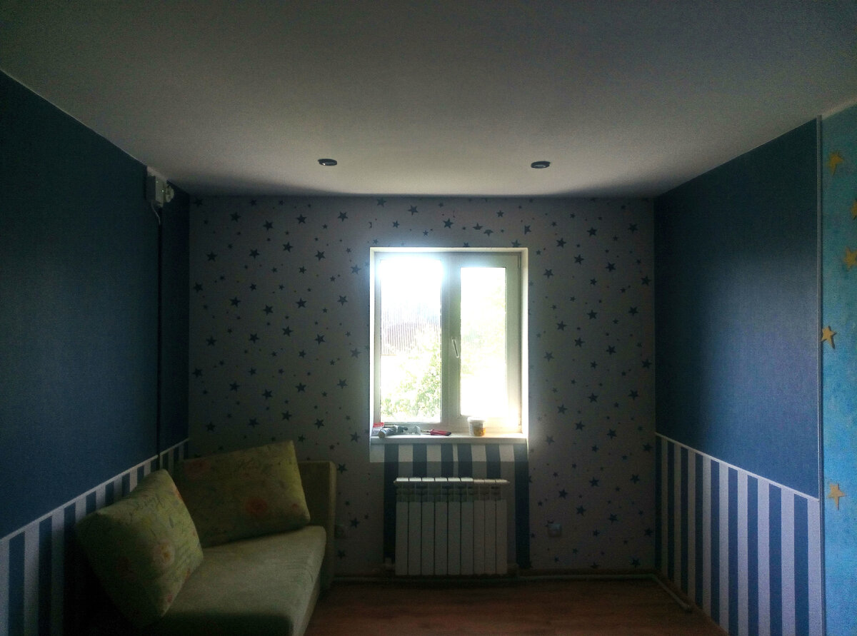 Хотя, конечно, в наших бесконечных ремонта все же есть перерывы. Но стоит с головой погрузиться в удивительный мир шпатлевок, красок и прочих строительных радостей- и всё это становится чем-то хроническим. Мы купили дом уже готовый к проживанию. Поэтому постепенно переделываем все под свой вкус. Вот, например, почти окончена ремонтная эпопея с одной из детских комнат. Из розовой комнаты (розовый-любимый цвет бывшего хозяина дома, по всей видимости) постарались сделать что-то поприличнее. Всё делал Саша -грунтовал, шпатлевал, шлифовал, красил, клеил обои( и плевался, потому что не любит обои), сделал звёздочки из штукатурки, поставил розетки, плинтуса декоративные сделал и приклеил. Мой скромный вклад- кусочек покрашенной стены со звездами, ну и уборка после ремонта. Остаётся доделать каминную трубу, завтра приедет новый карниз-повесим шторы, ждём кровать. Эта комната задумывалась для Адриана. Но по неведомо нам причине дети по одному жить не хотят, поэтому Адриан попросил жить в