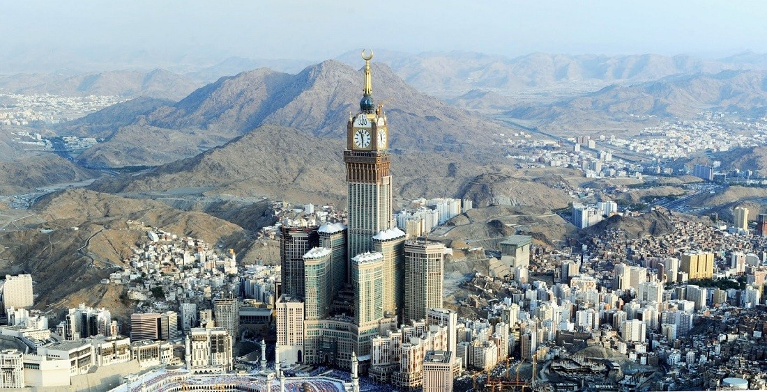На этой фотографии хорошо видно разнообразие аравийской природы. Большую часть территории страны занимают пустыни – как песчаные, так и каменистые. Огромная башня с часами – это комплекс небоскрёбов Абрадж аль-Бейт. На самом деле он ещё выше, чем кажется (530 метров, или 601 со шпилем).
