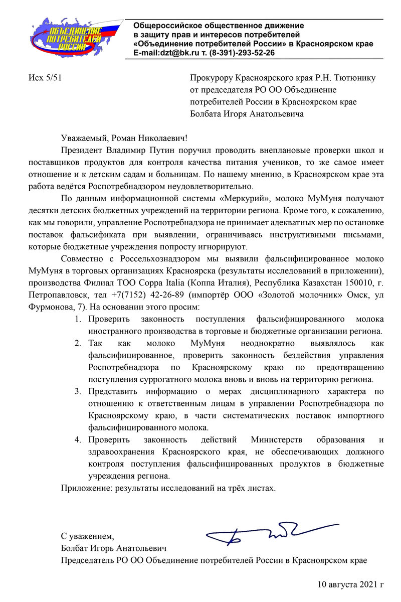 Уважаемый, Роман Николаевич! Президент Владимир Путин поручил проводить внеплановые проверки школ и поставщиков продуктов для контроля качества питания учеников, то же самое имеет отношение и к детским садам и больницам. По нашему мнению, в Красноярском крае эта работа ведётся Роспотребнадзором неудовлетворительно. По данным информационной системы «Меркурий», молоко МуМуня получают десятки детских бюджетных учреждений на территории региона. Кроме того, к сожалению, как мы говорили, управление Роспотребнадзора не принимает адекватных мер по остановке поставок фальсификата при выявлении, ограничиваясь инструктивными письмами, которые бюджетные учреждения попросту игнорируют. Совместно с Россельхознадзором мы выявили фальсифицированное молоко МуМуня в торговых организациях Красноярска (результаты исследований в приложении), производства Филиал ТОО Coppa Italia (Коппа Италия), Республика Казахстан 150010, г. Петропавловск, тел +7(7152) 42-26-89 (импортёр ООО «Золотой молочник» Омск, ул Фур