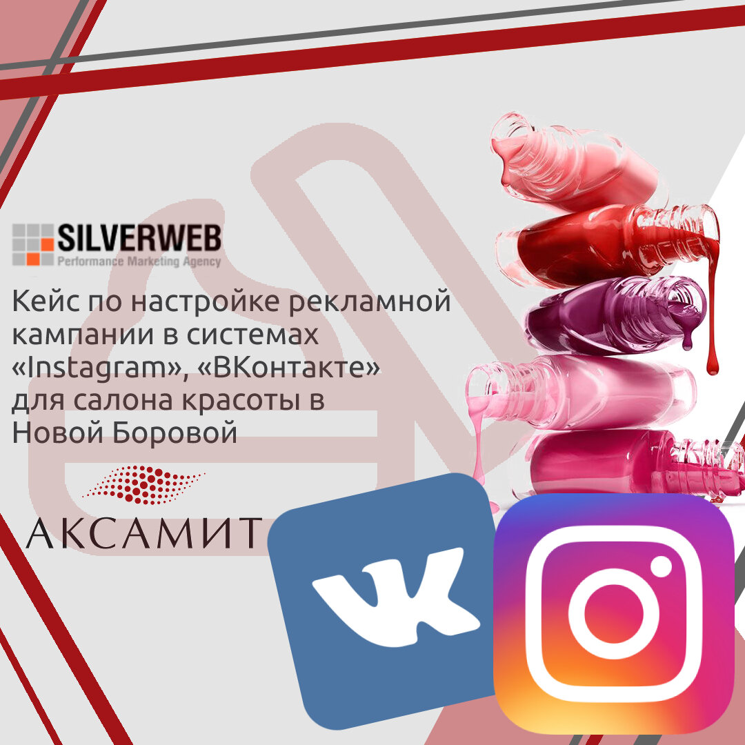 Проект url: axamit-salon.by О компании: «Аксамит» — студия красоты премиум-класса в Новой Боровой (д. Копище). Предлагает услуги парикмахеров по уходу, лечению, восстановлению волос, стрижке и окрашиванию, косметологические услуги, маникюр, педикюр, макияж, СПА-процедуры. Основные цели: Привлечение новых заказчиков и PR-студии посредством «Instagram» и «ВКонтакте». СПЕЦИФИКА КОМПАНИИ В компанию SILVERWEB обратился салон красоты “Аксамит” с целью продвижения своих услуг в социальных сетях. Данный салон работает в сфере красоты по многим направлениям: парикмахерские услуги, услуги ногтевого сервиса, косметология, массаж и спа-уходы, макияж и укладки, коррекция и окрашивание бровей. Компания находится в одном из районов города Минска – Новой Боровой, микрорайон Уручье. Это далеко не центр города, район находится за минской кольцевой дорогой. Так же стоит учитывать, что студия оказывает услуги в сфере кра