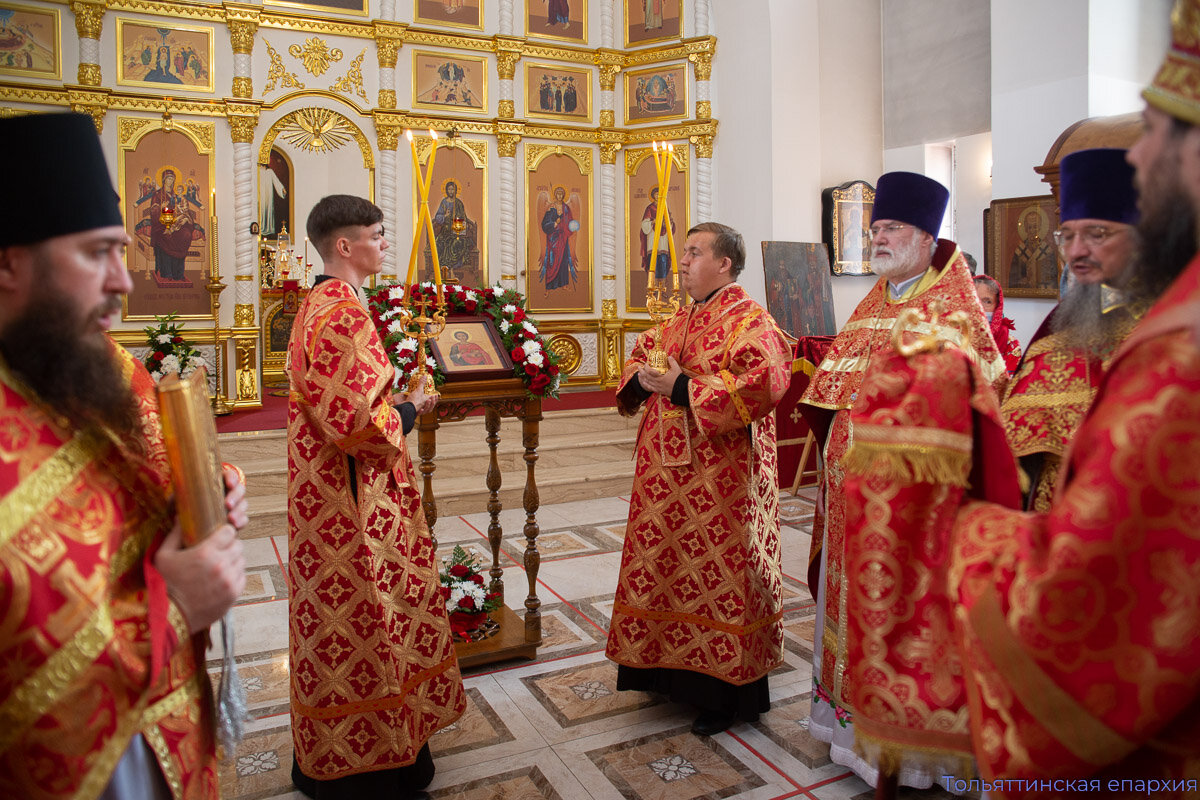 Его Преосвященству сослужили благочинный Невского округа протоиерей Александр Здоренко, благочинный Преображенского округа иеромонах Питирим (Чембулатов), клирики Пантелеимоновского храма: настоятель протоиерей Андрей Гриев, иерей Александр Стародубцев, иерей Максим Баранов. Песнопения Божественной литургии исполнили два певческих коллектива: хор Преображенского кафедрального собора под управлением диакона Игоря Тасеева и приходской хор под управлением регента Елены Кривовой. На богослужении присутствовал Главный врач Тольяттинской городской клинической больницы № 5 Алексей Николаевич Кирсанов, сёстры Свято-Елисаветинского сестричества, действующего при больничном храме.
