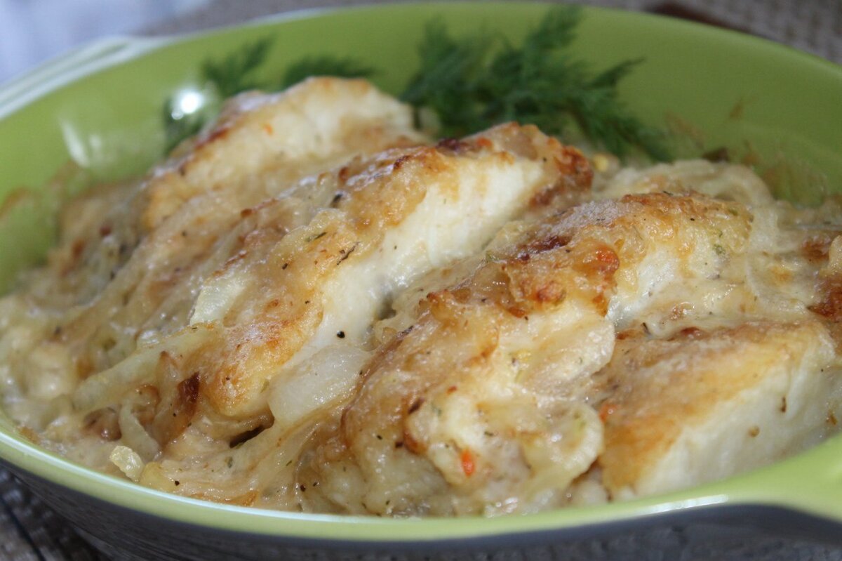 По этому рецепту рыба получается очень нежной, просто тает во рту. Готовить её очень просто и быстро, обязательно попробуйте, уверена вам понравится и вы часто будете готовить это блюдо. Нам понадобится: Филе белой рыбы ( у меня морской язык) лук репчатый сливки сыр твёрдых сортов мука соль специи любые для рыбы на ваш вкус немного растительного масла для жарки Приготовление: Филе рыбы нарезать на порционные кусочки, подсолить, добавить специи. Затем обвалять каждый кусочек в муке и обжарить с двух сторон до золотистой корочки. Лук нарезать полукольцами ( если лук крупный, то четверть кольцами ), обжарить на растительном масле до золотистого цвета, чуть чуть подсолить в процессе жарки. Залить обжаренный лук сливками и тушить 5 минут на медленном огне. Форму для запекания смазать маслом и выложить в неё кусочки рыбы. Сверху залить луково-сливочным соусом, немного посыпать натёртым сыром и отправить в разогретую духовку при температуре 180-200 градусов. Запекать до румяной корочки, приме
