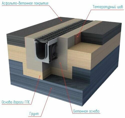 Схема установки лотка в асфальтобетонное покрытие и тротуарную плитку в зоне с интенсивным движением