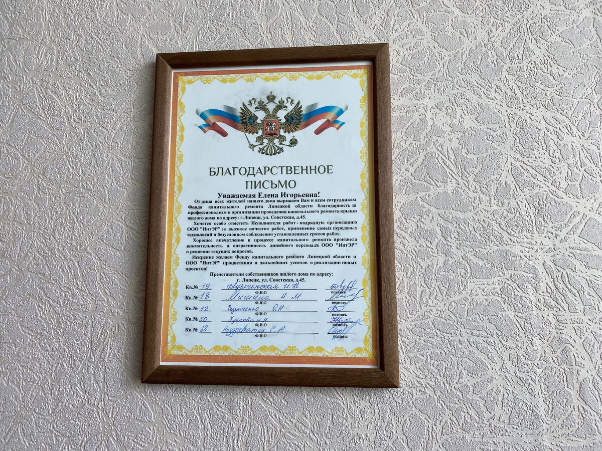Благодарственное письмо прислали жители дома № 45 по ул. Советской в Липецке. В 2021 году в многоэтажке был сделан капитальный ремонт крыши. «Уважаемая Елена Игорьевна! От лица всех жителей нашего дома выражаем Вам и всем сотрудникам фонда капитального ремонта Липецкой области благодарность за профессионализм в организации проведения капитального ремонта крыши. Хочется особо отметить исполнителя работ – подрядную организацию ООО «ИнтЭР» за высокое качество работ, применение самых передовых технологий и безусловном соблюдении установленных сроков работ», - говорится в письме.