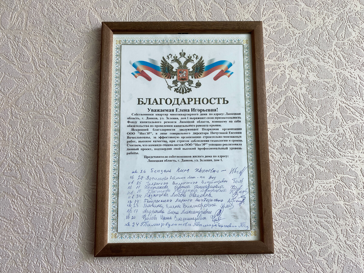 Благодарность от жителей дома № 1 по ул. Зелёная, г. Данкова