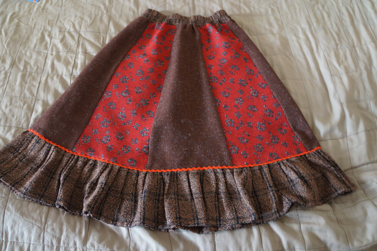 Шерсть красная в цветочек, шерсть коричневая и полушерсть в клеточку. Всего было по чуть-чуть. Выкроила клинья из двух шерстюшек. Пояс и нижний волан шерсть с вискозой. на отделку тесьма вьюнок. Если бы у меня был трикотаж лапша, я пришила бы его. Трикотажный пояс не даёт складок по талии и сидит намного лучше, по фигуре. Получилась оооочень тёплая юбочка на холодную зиму.