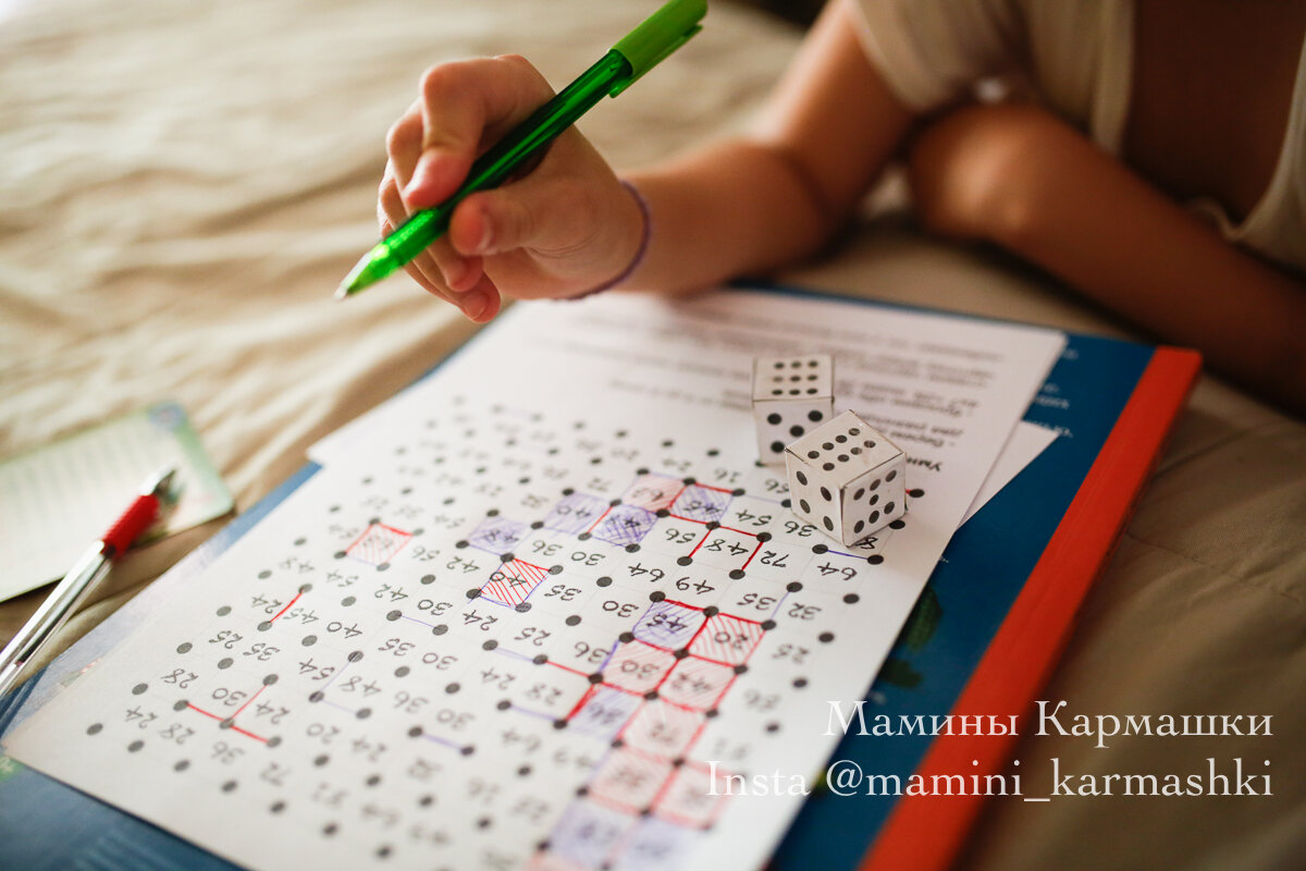 Лето, а мы обнаружили, что у обеих школьниц ощутимые пробелы в таблице умножения (учат ее сейчас "галопом по Европам", к сожалению). Учиться летом никто не хочет, а вот играть - с радостью. Начала писать статью про наш любимые игры с таблицей умножения, а материала набралось на три статьи. В этой покажу вам самую простую игру для детей, в которую мои играют без отрыва. Саму игру мы подсмотрели на иностранном сайте, но в оригинале игра только с таблицей умножения от 1 до 6, так что мы ее доделали, дополнили и сделали макеты для печати. Делимся. Для игры на умножение вдвоем нам понадобятся: - 2 кубика, - 2 разноцветных ручки или фломастера, - игровое поле (можно распечатать с шаблона или нарисовать самим) Думаю, что играть можно и втроем-вчетвером, тогда нужно будет цветных карандашей по числу участников. Игра очень простая (на наших шаблонах продублированы правила): Мы приготовили два вида игрового поля и два вида кубиков: - традиционные от 1 до 6 (в эту часть