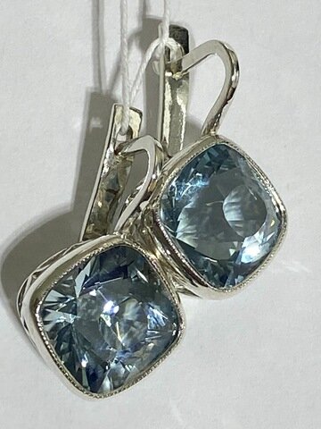Длина серег 2,5 см. Камень 1,3*1,3 см. Цена серег 5420 Квадратный кварц, цвета топаз голубой, в резной серебряной оправе. Серебро 925 пробы