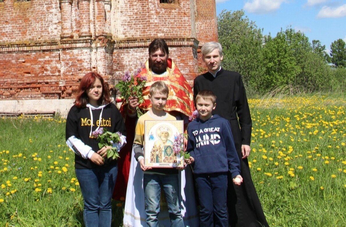Основной храм с приделом святителя Николая здесь порушен, поэтому Литургия была во временном уютном храмушке, который стоит на живописном месте. Ребята с радостью помогали на службе и в подготовке к ней. А дальше мы поехали на молебен в другой порушенный храм. Никольский храм в селе Черленково порушен в советские годы, но молитва здесь не прекращается...