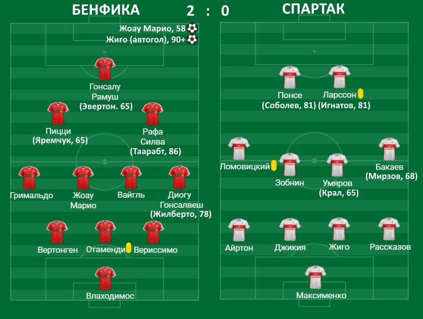 Витория приготовил к матчу новую схему. "Спартак" вышел играть 4-4-2. Нобель Арустамян почему-то говорил о 4-3-3, но и близко на поле не было подобного. Оборона средним блоком действовала по 4-4-2, а вот низкий блок временами включал в себя шесть (!) защитников в линию. Бакаев и Ломовицкий старались накрывать крайних защитников "Бенфики", игравших высоко, и опускались в линию зашиты. Провальная тактика на матч от Витории, где твоя команда обязана прессинговать и атаковать. К слову, прессинг не работал совсем. Понсе и Ларссон пытались поддавливать центральных защитников "Бенфики", но те спокойно отыгрывались с опорными и крайними защитниками, так как Зобнин и Умяров боялись бросить опорную зону, а Бакаев и Ломовицкий караулили фланги в обороне. Было неясно, кому нужно забивать? Трусливая модель игры на выезде от Витории. "Бенфике" было удобно играть с соперником, располагающемся на своей половине поля, не прессингующим. Португальцы взяли мяч (да и матч) под контроль, пытались различным