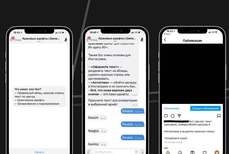 Красивый и необычный шрифт в комментарии, посте или описании профиля — всегда очень эстетично. Это намного интереснее и привлекательнее обычного текста. Вы точно видели такое оформление в TikTok или Instagram, но в самих соцсетях изменить шрифт нельзя. Нужно пользоваться сторонними решениями — например, бесплатным ботом GameFont. (http://t.me/gamefontbot) Там 50+ шрифтов на любой вкус и цвет. В боте, помимо изменения шрифта, вы разделите текст на абзацы, центрируете его или сделаете красную строку. Даже обойдёте цензуру в Instagram — изменив стиль «запрещённого» текста так, чтобы не получить бан. Всё очень просто. Например, чтобы изменить шрифт — нажимаем на кнопку нужного шрифта и присылаем текст для конвертации. Или для написания текста с красной строки ставим две точки перед ним: «..Красная строка». В общем, @gamefontbot (http://t.me/gamefontbot) — мастхэв для всех, кто публикует что-то в соцсетях или хочет похвастаться перед друзьями. #лайфхак