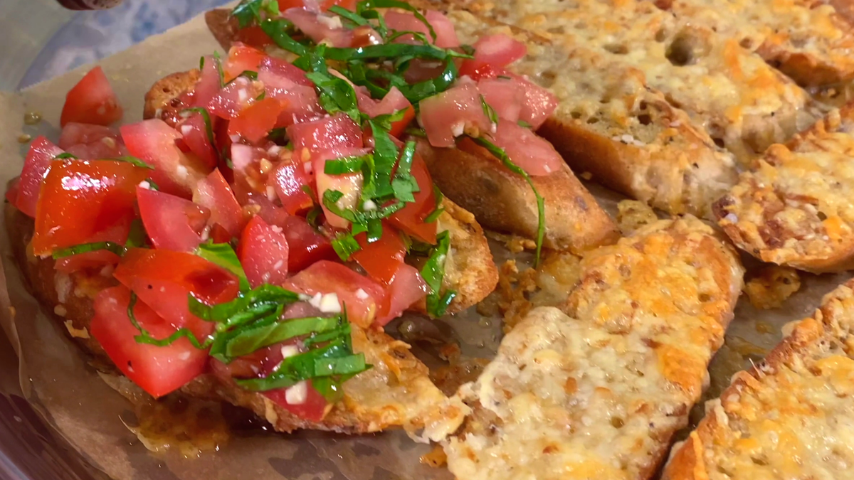 Хлеб с помидором, что может быть вкуснее? Сегодня я покажу Вам простой рецепт вкусной закуски из багета и помидора. Часто такую закуску подают с вином и пользуется она особой популярностью летом. Ведь такая закуска освежает, а сочетание ингредиентов Вам обязательно понравится. Это блюдо принадлежит Итальянской кухне и по праву считается народной закуской. Ингредиенты: Пошаговый рецепт: Нарежу мелко чеснок. Я не зря начал измельчать чеснок первым, хочу чтобы доска была чесночной. Разделяю чеснок на две половину, одну половину убираю. Через 5 минут достаю хлеб из духовки и посыпаю сыром и отправляю в духовку чтобы сыр расплавился. Приготовлю вкуснейший салат из помидор. Помидоры необходимо нарезать мелким кубиком. свежие листья базилик нарежу тонкими полосками. Соединяю все ингредиенты в посуде, добавляю чеснок, оливковое мало, соль и душистый перец. Достаю хлеб из духовки и выкладываю салат из помидора сверху на хлеб. Сбрызну несколькими каплями бальзамического уксуса багет с салато