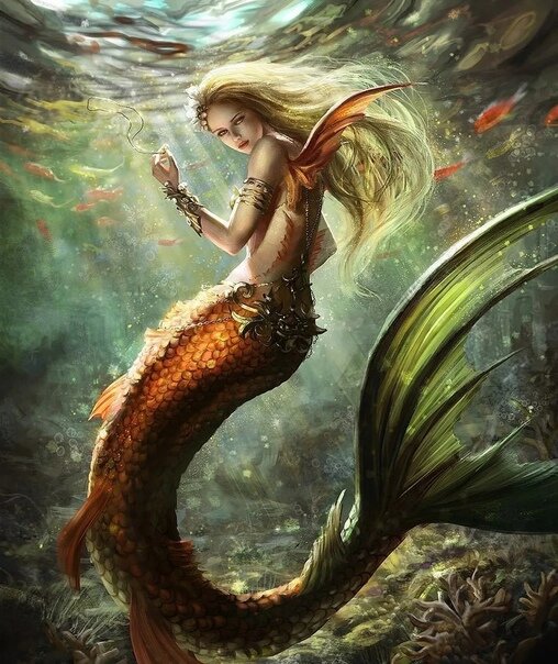Она вынырнула из воды, блеснув своей сверкающей чешуёй. Женщина, обладающая рыбьим хвостом. Я не мог поверить своим глазам. В полном замешательстве я стоял и глядел на это чудо природы, скрытый зарослями высокой травы. Она вылезла на берег и растянулась на траве. Удивительно гибкое тело, длинные рыжие волосы, невероятной белизны кожа и огромный хвост - всё это приковывало моё внимание. Неожиданно она обернулась, и мне удалось рассмотреть её лицо. Оно совершенно поразило меня. Будто высеченное из слоновой кости, оно было тонким, с правильными чертами. Большие тёмные глаза с длинными ресницами были обворожительны. Она смотрела куда-то вдаль, совершенно не замечая моего присутствия. Я же тем временем думал, что мне делать дальше. Мне не хотелось её пугать, но уйти просто так, даже не заговорив с нею, я не хотел. Я решил, что дождусь подходящего момента и попытаюсь предпринять какие-то действия. Неожиданно где-то рядом со мной пробежал какой-то маленький зверёк, и я резко дёрнулся, испу