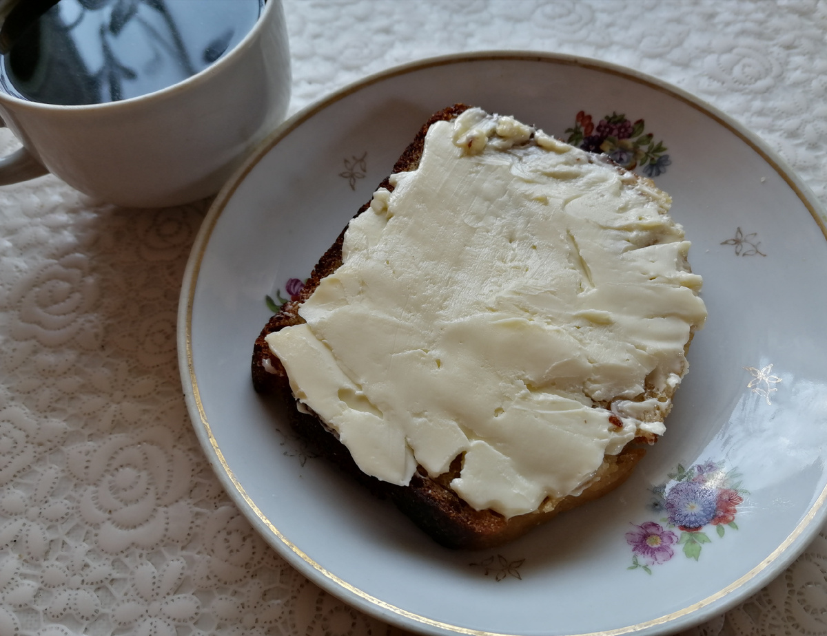 5 000 рублей на продукты и мелкие покупки для дома. Трое взрослых + коты. Подчищаем запасы и экономим. Завтрак. Все совсем просто - бутерброды со сливочным маслом, а за кадром - три последние сосиски из морозилки, на двоих). Кофе. Как хорошо, что у нас всегда приличный запас кофе, не представляю начало дня без чашки этого ароматного напитка. Посмотрела сейчас на бутерброд и вспомнила - раньше очень любила бутерброд с маслом и к нему хороший помидор. А сейчас что-то перестали так есть. А вы пробовали такое сочетание? У меня сегодня очередная партия заготовок, а обед приготовил муж. Одно из своих коронных блюд). Обед. Макароны, обжаренные с луком и ливерной колбасой. И помидоры, ко