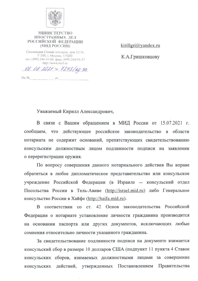 Столкнулись сразу с несколькими случаями, когда человек уехал за границу, возвращаться не планирует, а оружие осталось. В некоторых случаях это имущество совсем не дешевое. Что делать, как его переоформить на нового владельца? Чаще всего этим вопросам задаются когда происходит изъятие оружия… Ситуация не простая, с одной стороны можно действовать если кто то имеет генеральную доверенность, но есть и другой вариант, например заполнение и заверения заявления на отчуждение оружия консулами той страны где находится гражданин. Вот официальный ответ Министерства иностранных дел: Теперь интересно узнать что об этом думают в Росгвардии? Вопрос об этом в Росгвардию направлен, как придет ответ мы вас ознакомим. Что вы думаете об этой проблеме? Может был опыт оформления оружия в такой ситуации?