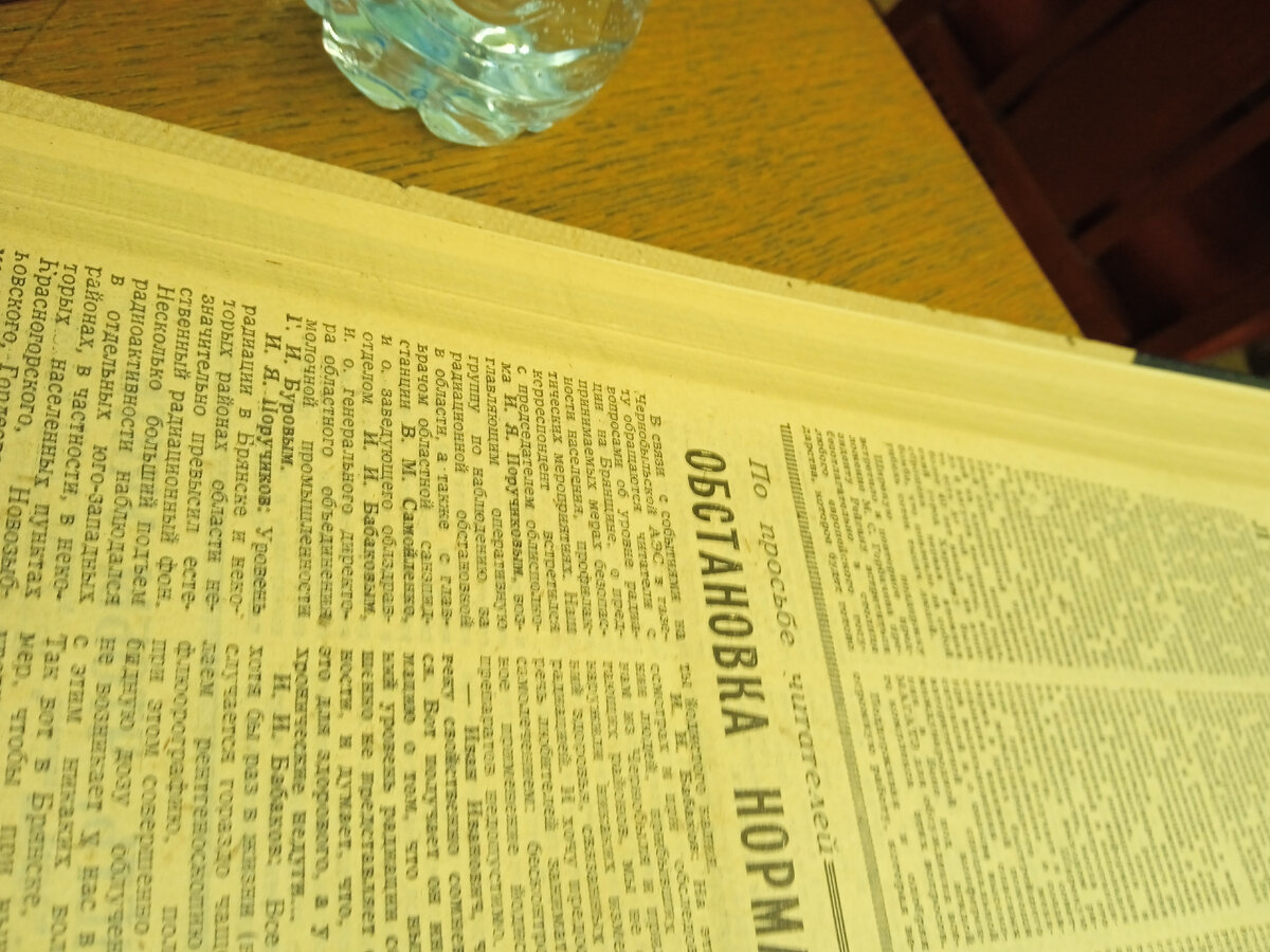 Брянская пресса, 1986, апрель-июнь, Газеты Брянский рабочий, Брянский комсомолец, Труд (Клинцы), Деснянская правда. Ни слова об аварии на ЧАЭС до аж 14 мая. Зато призывы выйти на майскую демонстрацию, клич о повышении урожайности (отравленных радиацией) картофеля и зерна, заявление тогдашнего главного санитарного врача области, что в мае дескать радиационная обстановка нормализовалась. Потом под июнь начались призывы собирать деньги чернобыльцам, когда сами жители Брянской области пострадали не меньше, а то и больше. По причине того, что хотя бы из-за сарафанного радио белорусы и украинцы были более информированы.