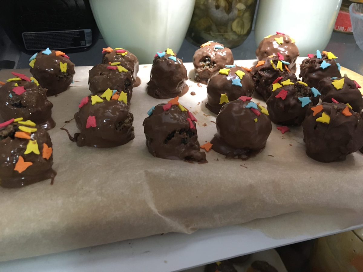 Почему при упоминании слов правильное питание, сразу же возникают мысли :"Если правильно,значит невкусно,долго готовить,много заморочек". Нет, нет и нет . Честно говоря,это мои первые мысли о ПП. Я не сижу на ПП,но все же стараюсь исключать вредную еду из своего питания. Эти конфеты мне понравились своим максимально простым приготовлением. Что нам нужно? -Темный шоколад -Финики- 200/300 гр -Грецкие орехи/миндаль/кешью/арахис/фундук (в выборе не ограничивайтесь) -Кокосовая стружка,либо глазурь (на ваш выбор) Измельчите блендером финики,предварительно освободив косточку. Далее орехи тоже измельчите блендером. Смешайте и сделайте форму желаемой конфеты.(У меня шарик) Чтобы было удобнее лепить, используйте воду.Тогда финики не будут липнуть к рукам. Дальше растопите на водяной бане плитку шоколада и обмакивайте готовый шарик в шоколад.