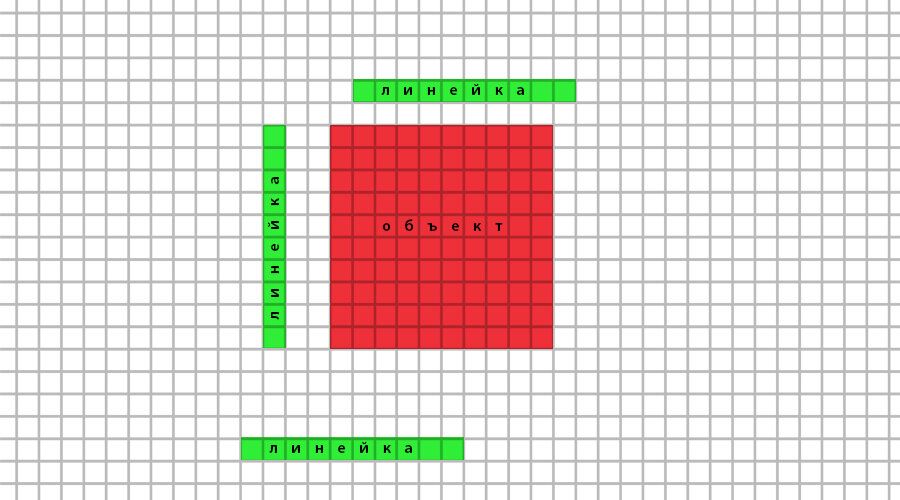 Теперь представим, что у нас есть некий материальный кубический объект размером 10. Это означает, что в построенном нами пространстве этот объект будет представлять заполнение 10х10х10 элементарных кубиков. В дополнение к этому у нас будет измерительный инструмент - линейки, состоящие из одного ряда элементарных кубиков в количестве 10. Мы можем перемещать объекты внутри пространства но таким образом, что сами кубики не будут двигаться, будут перемещаться лишь их состояния. На рисунке эти состояния соответствуют тому раскрашен кубик или нет.