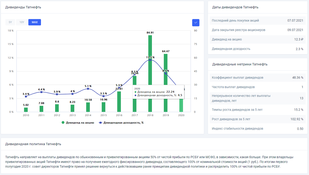 Хотя на финальные дивиденды за 2020 г. Татнефть направила около 60% от чистой прибыли по РСБУ. Тогда дивиденд на акцию может составить 20,5 руб. на оба типа акций. Соответственно можно ожидать дивидендную доходность за I пол. 2021 г. от 4,5% до 7,4%.