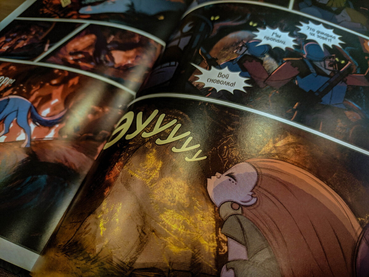 Надпись на странице книги гласит: «Издание для досуга. Для младшего школьного возраста», а я не согласен. Книга для всех! Ребята из команды издательства МИФ проделали огромную работу — перевели на русский язык, оформили и издали книгу «Wolfwalkers: the graphic novel» Томма Мура, Росса Стюарта и Сэма Саттина. Это вау! Что нужно знать об этой книге: Внешний вид Твёрдая обложка, плотные листы, запах свежей типографской краски на новеньких хрустящих страницах... Каждый раз убеждаюсь, что любая книга издательства «Манн, Иванов и Фербер» могла бы спокойно выставляться в лучших музеях современного искусства. Но кое-что сбивало мой ритм чтения. Похоже на личную проблему. Сейчас расскажу, а вы рассудите. Видимо, с непривычки к графическим новеллам, мне хотелось читать слева→направо всю горизонталь на обеих сраницах. Хотя нужно читать сначала одну страницу, а после переходить на вторую. С текстовыми изданиями никаких проблем, но здесь по обеим сторонам яркие иллюстрации, которые соревнуются за в