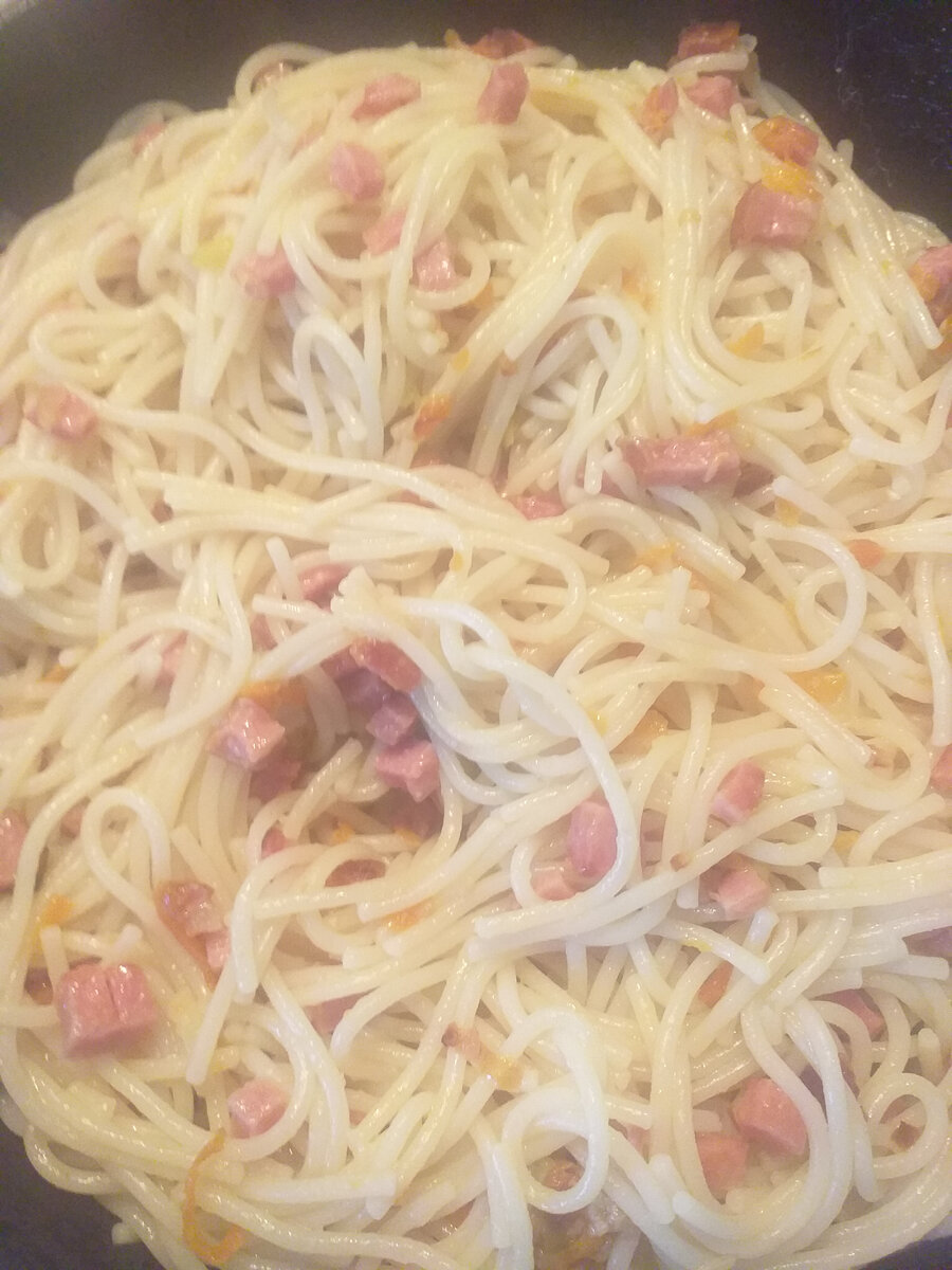 1.Налейте в широкую кастрюлю воду (примерно 2,5литра). Поставьте на огонь. Когда закипит, посолите,налейте столовую ложку растительного масла, чтобы не слиплись. Выложите лапшу. Варите их на слабом огне, периодически помешивая. Отварите до готовности . Откиньте на дуршлаг. Промойте водой. 2. Лук очистите и нарежьте мелкими кубиками. 3. Морковь натрите на крупной терке. 4. В сковороду налейте масло, обжарьте лук и морковь 5 минут. 5. Добавьте мелко нарезанный перец,чеснок. 6. Колбаску нарежьте кубиками, добавьте к овощам. Обжарьте 5 минут. 7.Перекладываем лапшу к овощам с колбасой, добавляем специи по вкусу, прогреваем пару минут. Даем постоять на плите минут пять под крышкой. Продукты: Вода 2,5л. Макароны 300г Лук репчатый 1шт Морковь 1шт Перец 1шт Чеснок 1зубчик Соль по вкусу Специи по вкусу Приятного аппетита.
