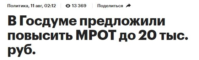 До выборов остается совсем немного, а потому в ход начинают идти главные козыри. Так, депутаты из ЛДПР вносят в Госдуму законопроект о повышении минимального размера оплаты труда до 20 тысяч рублей с 2022 года. Напомню, что сейчас МРОТ составляет 12 792 рубля, а повышают его примерно на 5% ежегодно. Причем, есть специальная методика пересмотра МРОТ: он устанавливается в размере 42% от средней медианной зарплаты за предыдущий год. На 2022 год его планируют установить в размере 13 617 рублей.