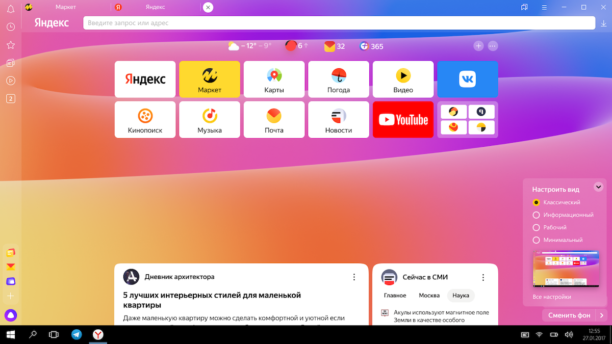 Возможность персонализировать внешний вид — отличительная особенность Яндекс.Браузера. Его пользователи могут не только анимированный фон выбрать, но и цвет и форму вкладок, размер Табло, состав виджетов на новой вкладке. Это полезно, ведь у каждого из нас свои привычки в работе с браузером. Кто-то запускает его, чтобы узнать что-то новое и интересное. Другие — чтобы сконцентрироваться над работой. Сегодня мы начинаем тестировать новую бета-версию, в которой каждый из нас сможет выбрать тот облик Браузера, который лучше всего соответствует задачам и привычкам. Классический По умолчанию этот вариант новой вкладки не сильно отличается от привычного. То же Табло, тот же Дзен. Разве что информация о погоде, пробках и новых письмах теперь более компактна и размещается над Табло. А ещё новости переехали прямо в ленту Дзен. Информационный Этот вариант понравится тем, для кого новости и лента рекомендаций — ключевые элементы новой вкладки. Дзен заполняет всё доступное пространство, при этом Та