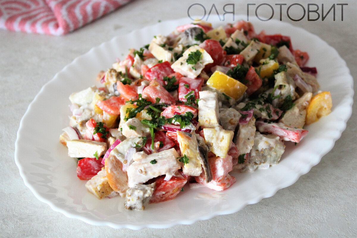 У меня на канале уже есть небольшая коллекция рецептов для любителей баклажанов, особенно много салатов. И сегодня еще один рецепт достойный вашего внимания. Придумался он случайно и получился гораздо вкуснее и интереснее, чем я ожидала. Два баклажана нужно запечь в духовке предварительно проткнув их в нескольких местах ножом. Запекаю я их обычно около 40-50 минут и даю полностью остыть, затем снимаю кожицу. Пока баклажаны "сидят" в духовке занимаюсь приготовлением курицы. Одну небольшую куриную грудку разрезаю вдоль на три части, немного отбиваю и посыпаю специями и солью. Далее обжариваю на растительном масле до готовности, главное не пересушить мясо, поэтому держу на огне по 4-5 минут с каждой стороны. Очищенные баклажаны нарезаю кубиками. Точно так же нарезаю болгарский перец и помидоры, я взяла красные и желтые для цвета. Все отправляю в салатник. Немного остывшее мясо режу на небольшие кусочки и так же отправляю в салатник ко всем остальным