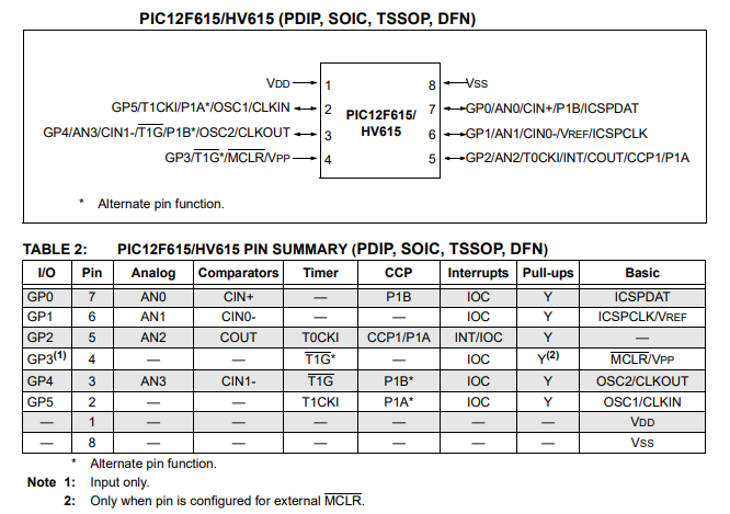 В данном уроке мы рассмотрим подключение микроконтроллера PIC12F615, и проверим его работу помигав светодиодом. Данный микроконтроллер имеет при небольших размерах неплохую конфигурацию и может пригодится когда необходимо обрабатывать пару сигналов: Параметры микроконтроллера PIC12F615: Схема подключения микроконтроллера PIC16F615 к программатору PicKit3: Данный микроконтроллер может работать на частоте 4Мгц или 8Мгц от внутреннего тактирования. Мы настроим данный микроконтроллер на 4Мгц. Настройки фьюзов вынесем в заголовочный файл main.h: ifndef MAIN_H