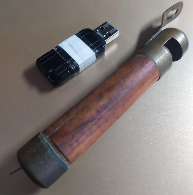 Сдуваю пыль со старой редкой рубрики!) Что это и для чего используется? Может быть именно вы-тот самый, кто знает о предметах на фотографии что-то интересное? Если у вас есть догадки, или вы уверены, что узнали ту или иную штуку - дайте знать! Если "штуку" узнали, то она появится в одном из следующих выпусков! Эта вещица сделана из дерева и латуни, Внутри есть два провода. Флешка - для того, чтобы показать размер. Что это? Судя по петле на одной стороне, эта вещь (скорее даже часть вещи) вешалась на стену. Может это часть какого-то фонаря?.. Но тогда зачем на той стороне в металлической части есть отверстие? Тяжелые латунные детали с маркировкой «.085R», около 8 см в длину. Есть сквозное отверстие, идущее через центр. На стенки отверстия и канала, кажется, напыление какой-то другой материал. Подпружиненная часть может удерживать предмет небольшого диаметра (на картинке зубочистку). Что это такое? Есть ощущение, что через отверстие проходил провод. Пластина, скорее всего, из нержавеющей