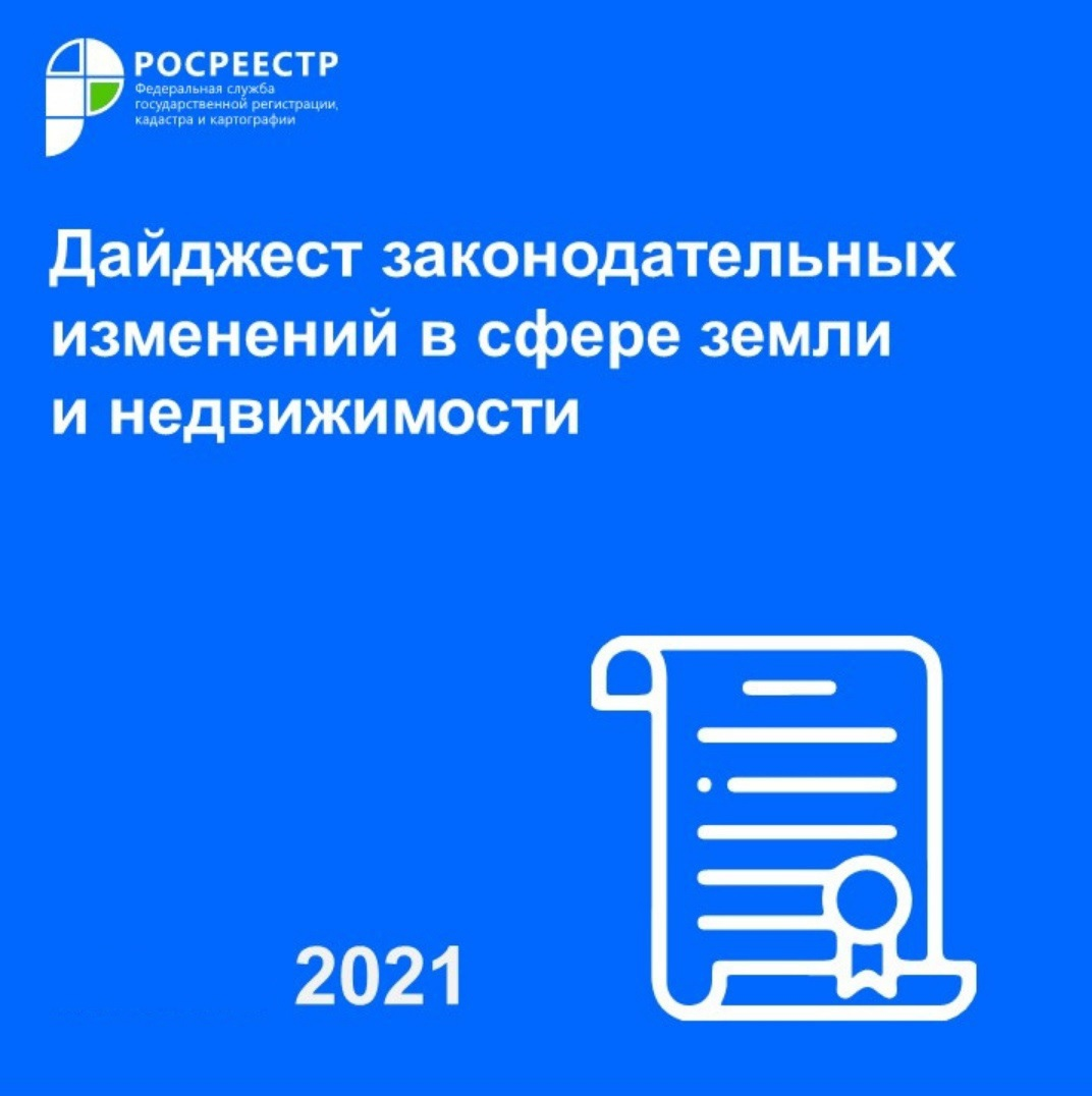 Друзья, хотим поделиться с вами важной и полезной информацией – Росреестр подготовил первый дайджест законодательных изменений в сфере земли и недвижимости. Документ поможет вам всегда оставаться в курсе правовых нововведений, связанных с деятельностью нашего ведомства. Все материалы дайджеста изложены в простой и понятной форме. Подобные дайджесты законодательных изменений от Росреестра будут составляться и публиковаться ежеквартально. Именно этот дайджест представляет собой свод изменений в правовых нормах, которые установлены вступившими в силу в 2021 году Федеральными законами № 120-ФЗ, 191-ФЗ, 273-ФЗ и 275-ФЗ. С текстом дайджеста вы можете ознакомиться по ссылке: https://rosreestr.gov.ru/site/press/news/rosreestr-razrabotal-daydzhest-zakonodatelnykh-izmeneniy-v-sfere-zemli-i-nedvizhimosti/.