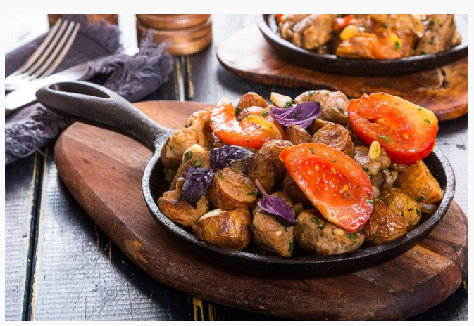 Ингредиенты: Приготовление: Шаг 1 Картофель тщательно помойте и нарежьте небольшими ломтиками. Лук очистите и нарежьте полукольцами. Шаг 2 Разогрейте в сковороде 2 ст. ложки подсолнечного масла и обжарьте кубики свинины 1 минуту на сильном огне, периодически помешивая. Затем добавьте лук, перемешайте и жарьте всё вместе ещё 1 минуту. Шаг 3 В сковороду к мясу с луком добавьте картофель и жарьте 5 минут на сильном огне, периодически помешивая. Шаг 4 Чеснок раздавите, очистите и нарежьте пластинами. У помидора удалите плодоножку, мякоть нарежьте дольками. Шаг 5 Листочки базилика отделите от стеблей (оставьте пару листочков на украшение). Кинзу вместе со стеблями и листочки базилика нарубите мелко. Шаг 6 В сковороду к мясу с луком и картофелем всыпьте сухую аджику, хмели-сунели и кориандр, влейте 150 мл воды, посолите, перемешайте, убавьте огонь до слабого, накройте крышкой и тушите 10 минут, изредка помешивая. Добавьте чеснок, перемешайте и тушите ещё 5 минут. Затем добавьте помидор, нару