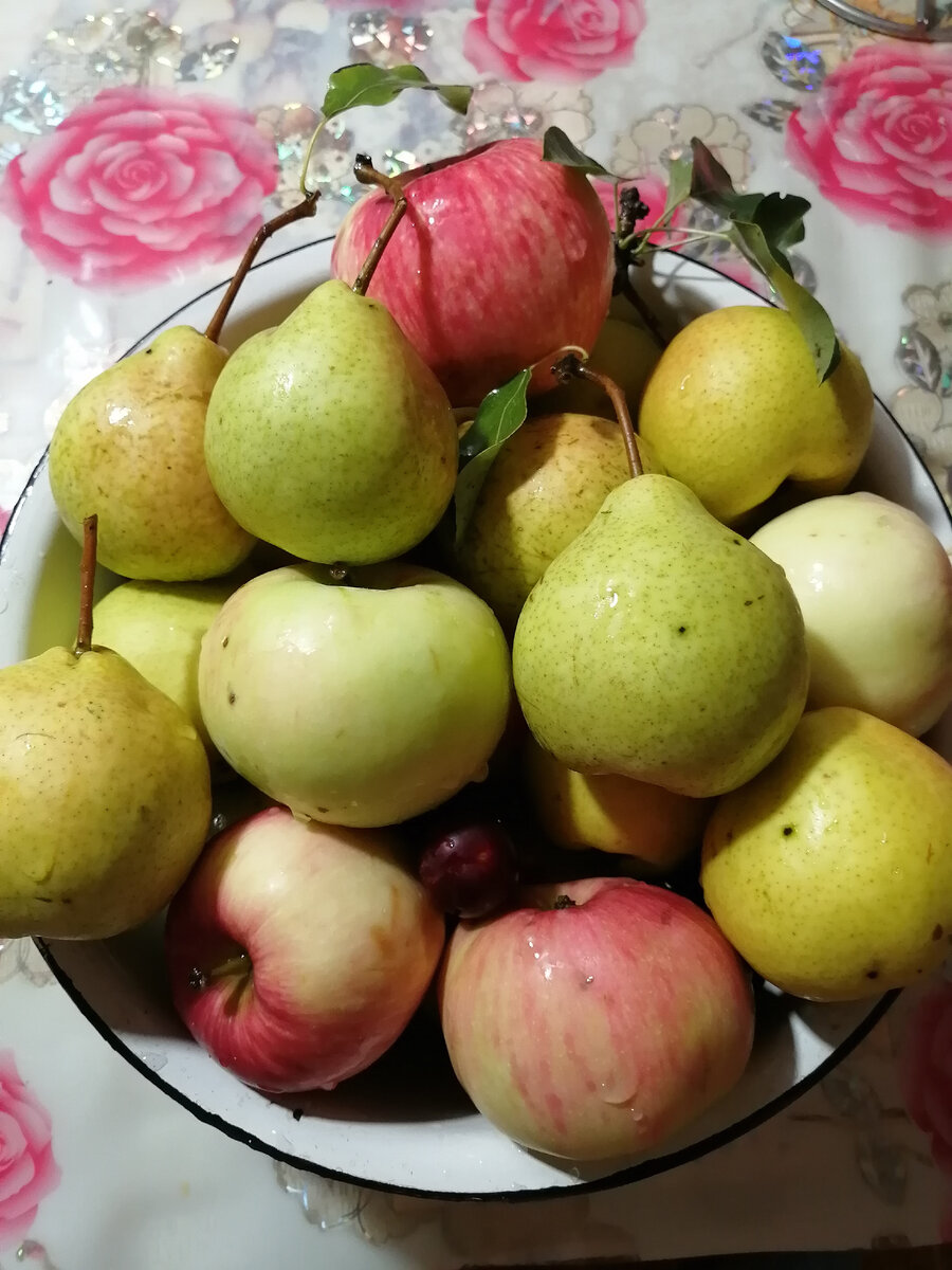 После обработки моего сада био препаратами и настоями нужных растений, после подвязки, кольцевания для улучшения урожая, пора этот урожай собирать и сохранять, чтобы зимой вновь ощутить все ароматы и вкусы прошедшего лета. Это всего лишь небольшая часть моего урожая. Нет ни одного червячка! Все яблоки и груши целые и неповрежденные мелкими вредными насекомыми. На поверхности есть небольшие черные точки. Это поверхность град побил. К сожалению, от этого природного явления невозможно спрятать урожай. Я решила, что такое огромное количество варенья нашей семье не съесть. Компотов тоже не выпить. Значит можно и нужно делать пастилу. Сразу оговорюсь. Торговать на рынке у меня нет времени, да и желания тоже. Не торгаш я. А вот делать разные вкусняхи это я с большим удовольствием! Итак. Вымытые яблоки и груши я очищаю от семян плодоножек и режу на крупные куски. Укладываю на противень, накрываю фольгой и ставлю в духовку на 180т градусов примерно на 20 минут. По прошествии этого времени я дос