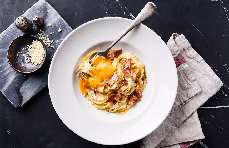 Ингредиенты которые Вам понадобятся: ПРИСТУПИМ К САМОЙ ГОТОВКЕ: ПРИСТЕГНИТЕСЬ)) 1. Добавьте 4 - 5 стакана подсоленной воды до быстрого кипения. Добавить спагетти и варить до готовности. 2. Тем временем поджарить бекон на сковороде до хрустящей корочки. Достаньте бекон и промокните на бумажном полотенце. Ждите когда остынет. 3. Удалите со сковороды все, кроме 1 столовой ложки беконного жира. 4. Добавьте 2 столовые ложки оливкового масла, чеснок в кастрюлю и варите, пока чеснок не начнет коричневеть (не горит). 5. Разбейте яйца в кастрюлю и варите, пока яичные белки почти не застынут (желтки все еще должны быть жидкими, чтобы создать соус.) 6. Добавьте в кастрюлю слитые макароны, бекон и измельченный красный перец и перемешайте, разбивая яичные белки. 7. Добавьте дополнительное оливковое масло (или вы можете использовать немного воды для макарон), если макароны не полностью покрыты соусом. 8. Перемешайте с сыром и петрушкой, посыпьте солью и свежемолотым перцем ВСЕМ ПРИЯТНО АППЕТИТА!