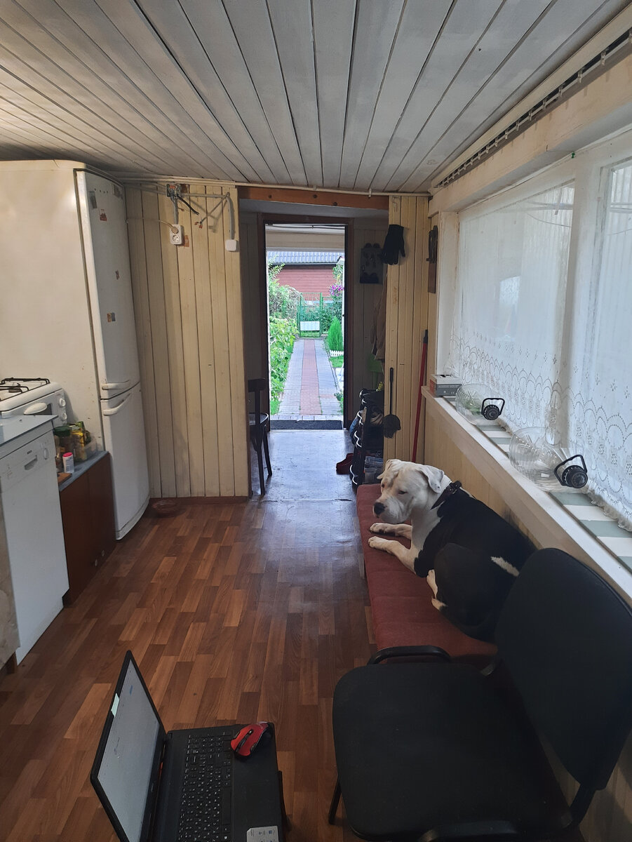 "Зубы!" - скажут обыватели. Нееет, есть кое-что страшнее зубов. Хотя бы потому, что вроде оно понятно, но пока не столкнешься - ни разу не очевидно. До этого момента я не жила в сферическом вакууме и прекрасно знала, что моя собака - сильная. Ну, как бы, слабый амстафф - это анекдот из разряда "колобок повесился". Но сейчас, разглядывая вмятину на холодильнике и погнутые металлические ножки стула, я осознаю, что явно недооценивала его мощь... Но обо всем по порядку. Сижу я на даче на веранде. Ну вот, собственно, фото - мой стул в правом нижнем углу. Вдаль уходит дорожка к запертой - естественно! - калитке. Шварца никто из соседей не боится, трехлетний ребенок спокойно сует руки ему в пасть, его мама переживает только за то, что руки грязные, но если калитку не запереть - собака отправится на соседский огород тырить помидоры - дома-то его в парник не пускают! Веган хренов, за огурец мать продаст... Поэтому - и только поэтому! - калитка заперта. Так вот, сижу я себе на стульчике, натр