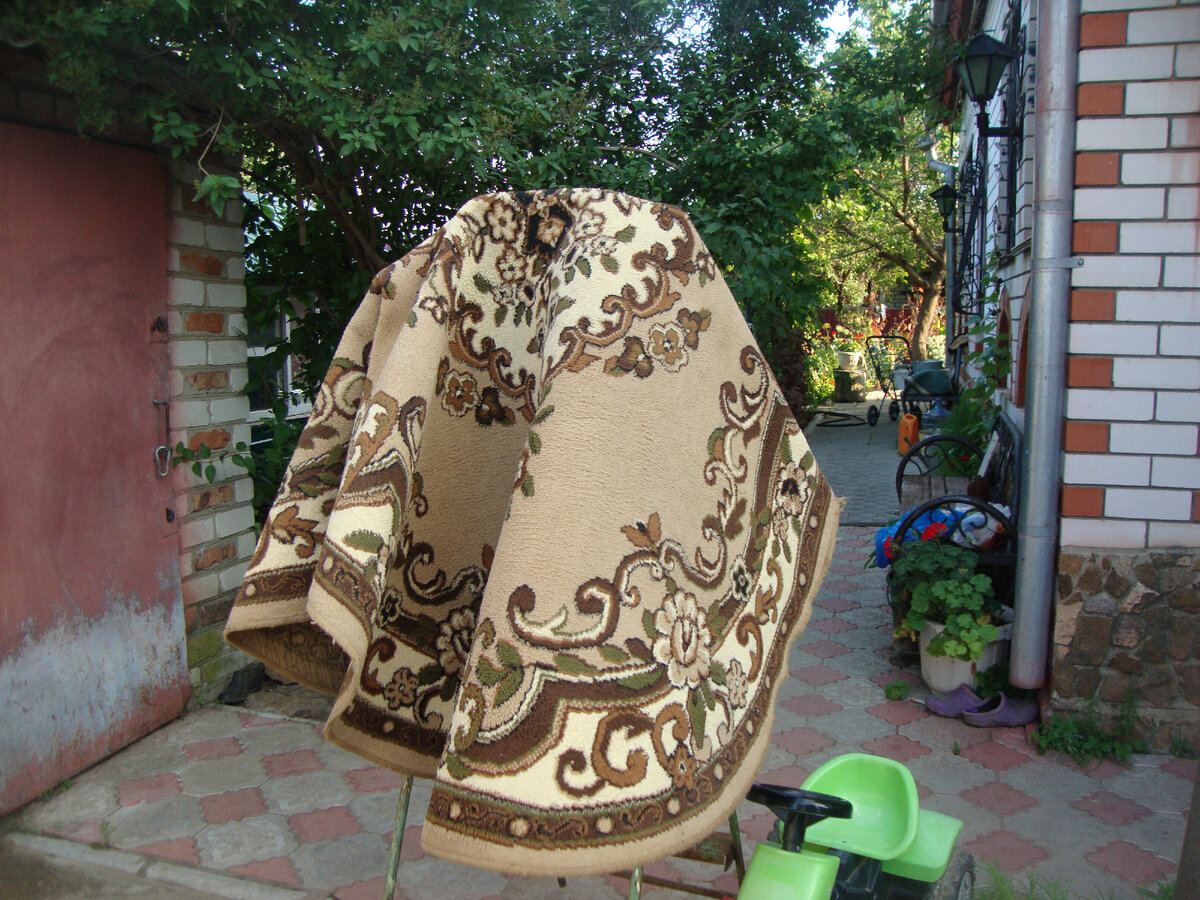 Солнце в этом году испытывает нас на прочность. Каждый день 36-39 градусов, а то и выше. Но даже такое пекло может принести пользу. Вот мы и решили использовать момент и помыть ковры. У кого есть дети, те знают, как они могут " ухлестать "все вокруг. За день двести раз забегут, то попить , то поесть,то друзей приведут, а обувь снять забыли. Порой, станешь раздевать, так песок сыпется ото всюду. Там компот пролили, здесь бутерброд уронил, вот так и " помогают " бабушке. Нам раньше их зять мыл из такой фигни, что машины моют. Очень чисто получается. Но он на работе ( вахта) пока приедет, погода может испортиться, решили сами помыть. Запаслись пастой "пальмира" , щетками ,и- вперёд. Сначала сильно натерли всю поверхность пастой, предварительно намочив ковер,а потом щеткой потерли. Немного постояв, начали смывать из шланга. Воды надо много. Отмывается все великолепно. Высохли к вечеру. Но в один день мыли только по два ковра. Воду жалко, ведь надо ещё поливать, а вода из колодца. Вот так