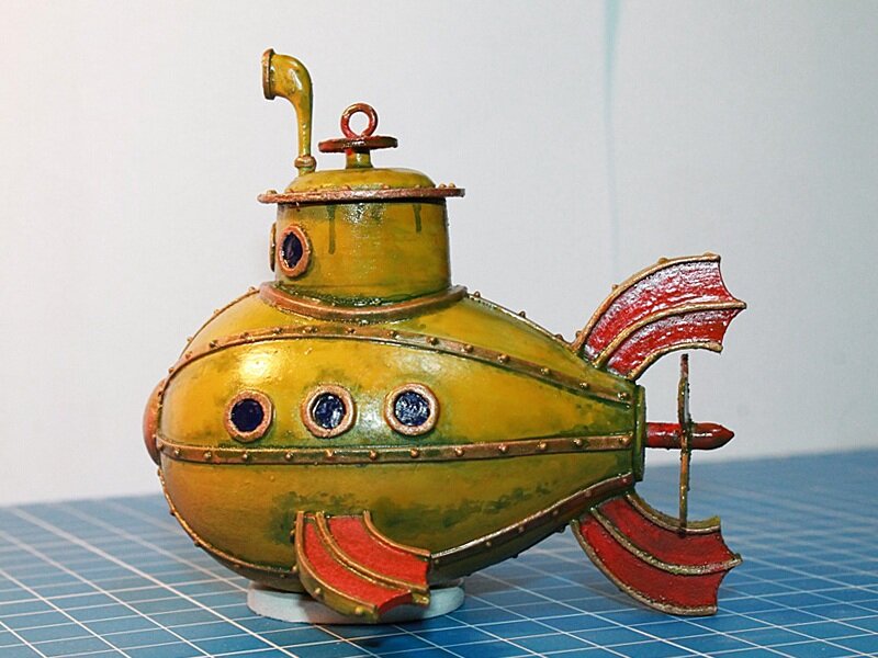 Тема поделок из яиц меня пока не отпускает и сегодня закончено очередное яйце-поделие. Теперь это подводная лодка. Почему желтая - ну, думаю отсылка к творчеству The Beatles понятна (форма - нет, именно цвет), чумазая - будем считать, что она в нашем водохранилище плескалась в период "цветения" воды. Поделие, опять же, можно хоть в качестве ёлочного украшения использовать, хоть на Пасху подарить Опять же - изготовлено всё из того же пенопластового яйца, которое оклеено при помощи клея ПВА туалетной бумагой, а потом тщательно вышкурено с мебельной шпатлёвкой. Всё остальное - листовой пластик и бумага. Окрашено красками "Звезда" И пара готовых штуковин В планах ещё несколько яиц преобразить - думаю, что не буду статьи плодить, а по мере изготовления буду редактировать эту