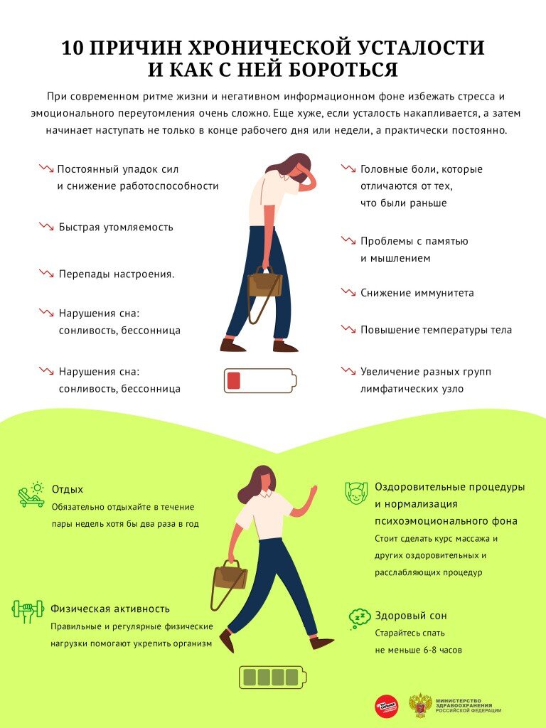 В норме любое сильное утомление проходит после полноценного сна и отдыха. Если же человек выспался и хорошо поел, но продолжает чувствовать себя вяло и утомленно, что мешает ему выполнять привычные дела, - это скорее патологическое состояние. Главный симптом хронической усталости - это беспричинная постоянная усталость, снижающая работоспособность в несколько раз. Однако это отражается и на психоэмоциональном самочувствии человека: ощутимо ограничивает повседневную жизнь и мешает общению, поскольку моральных ресурсов перестает хватать даже на близких. Кроме того, при хронической усталости возникает головная боль, ухудшение памяти, бессонница, тошнота и многое другое. Из-за разнообразия симптомов болезнь довольно трудно диагностировать.