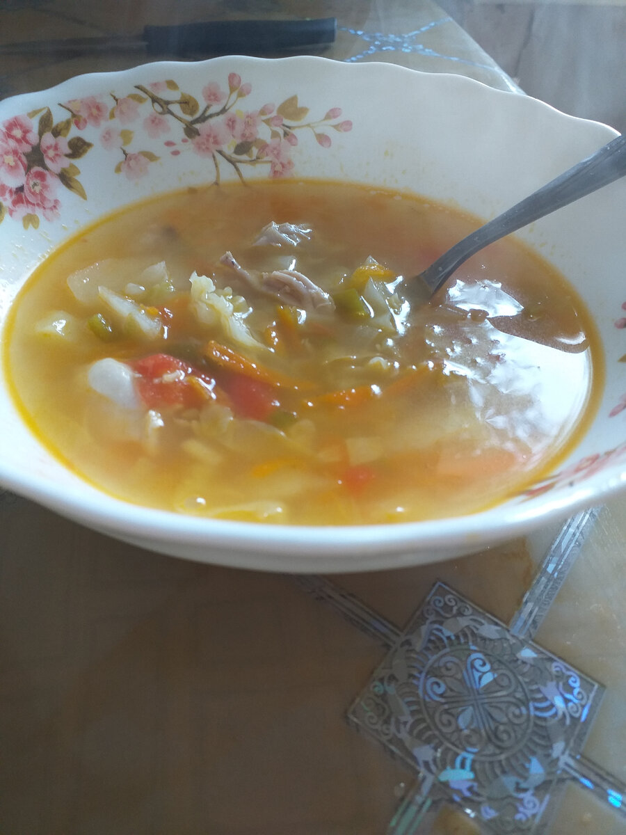 1.Куриные части хорошо промываем, кладем в кастрюлю и заливаем холодной водой. Накрываем крышкой и ждем закипания . После этого снимаем накипь, всыпаем половину соли, огонь убавляем и варим еще тридцать минут, время от времени снимая пенку. 2. Натираем на терке морковь, кладем в разогретое на сковороде масло, перемешиваем и пассируем 3 минуты. 3. Затем добавляем нарезанный мелкими кубиками лук, перемешиваем и готовим все 3 минуты. 4. Помидоры заливаем кипятком на пару минут, снимаем кожицу, нарезаем ломтиками. Кладем в сковороду. Готовим 5 минут. 6. Перец болгарский мелко нарезаем,добавим к овощам,готовим 5 минут. 7. Картошку нарезаем брусочками. Опускаем в бульон и варим 10 минут. 8. Капусту шинкуем соломкой. Отправлем к картошке. 9. Добавлаем заправку,соль,лавровый лист,специи,чеснок. 10. Варим до готовности капусты. 11.При подаче кладем в тарелку рубленую зелень . Приятного аппетита! Продукты: Курица 300г. Картофель 350г. Лук репчатый 100г. Морковь 80г. Томаты 130г. Перец